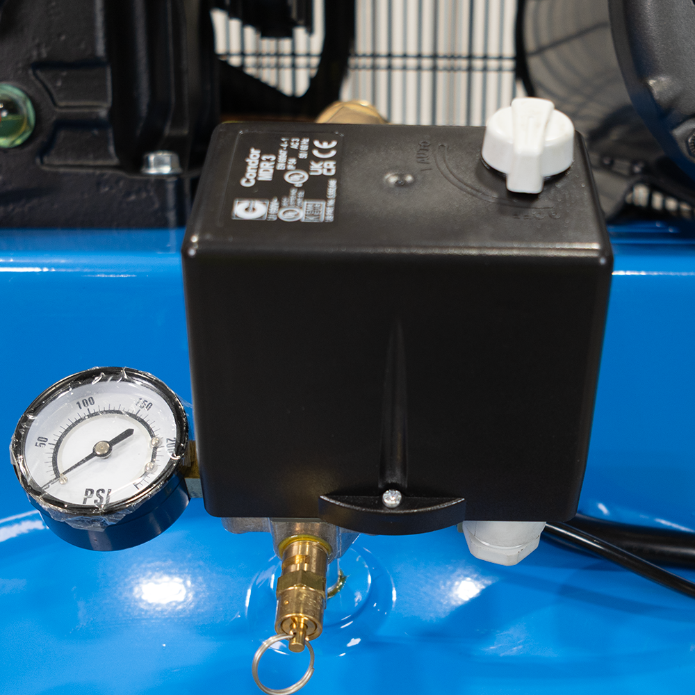 The large air receiver tank allows for fewer starts and stops. A certified safety valve and pressure gauge are included.